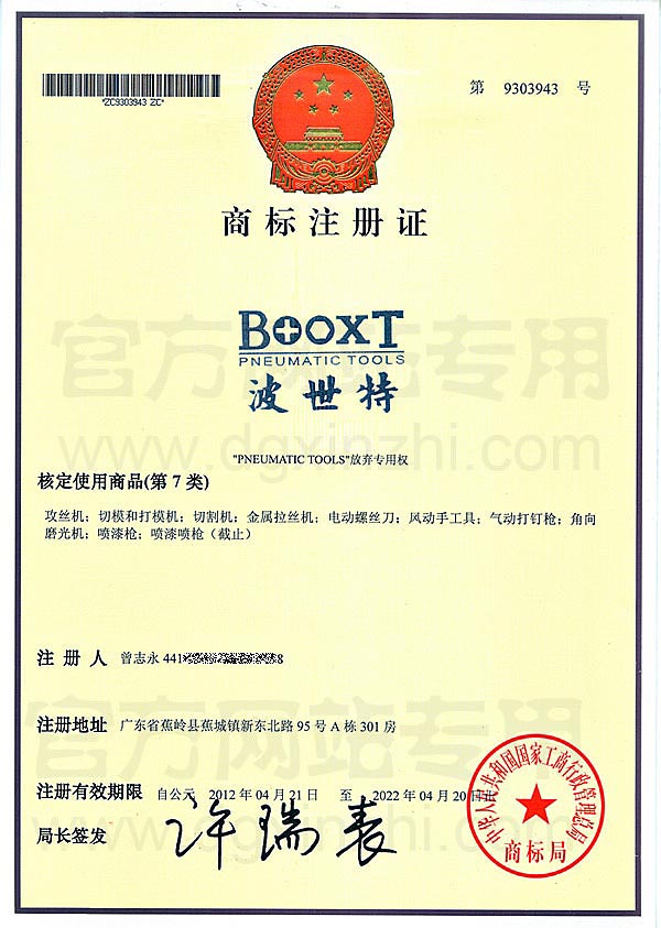 BOOXT波世特商標(biāo)注冊(cè)證  BOOXT第7類商標(biāo)注冊(cè)證
